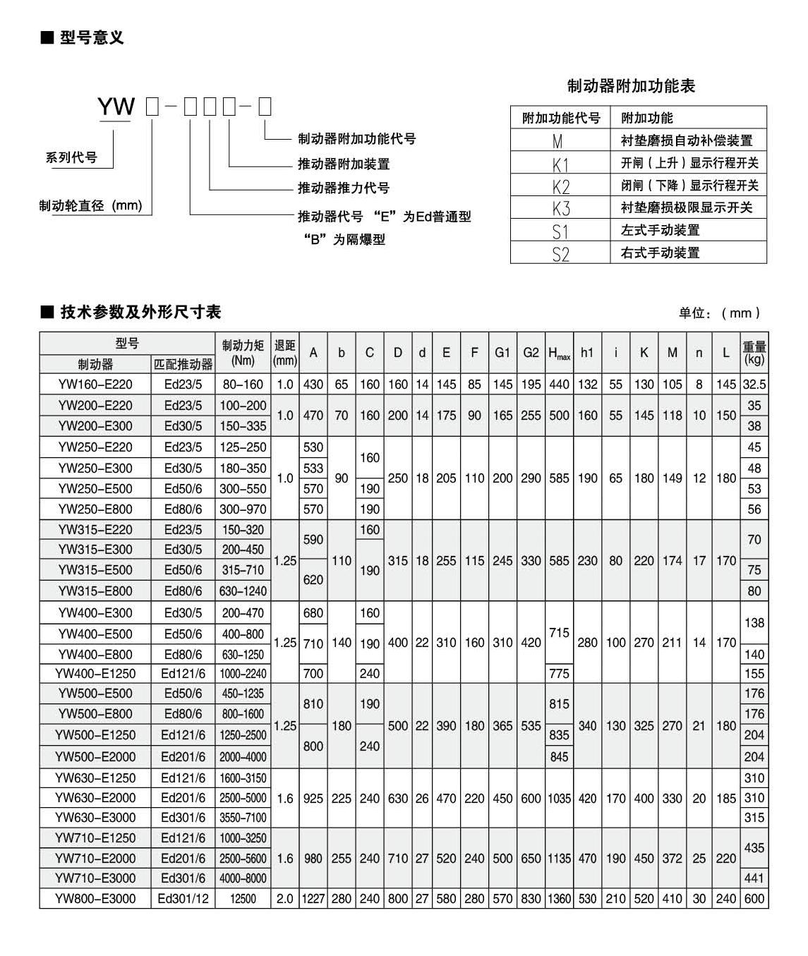 應(yīng)用:YW,YWZ13系列電力液壓鼓式制動(dòng)器,廣泛應(yīng)用于有防爆要求的各種起重運(yùn)輸、皮帶運(yùn)輸、港口裝卸、冶金及建筑機(jī)械中各種機(jī)構(gòu)的減速和停車(chē)(維持)制動(dòng)。符合標(biāo)準(zhǔn):YW,YWZ13系列電力液壓鼓式制動(dòng)器的連接尺寸和技術(shù)要求符合JB / T6406-2006標(biāo)準(zhǔn);制動(dòng)力矩參數(shù)符合DIN15435標(biāo)準(zhǔn),配套符合DIN15430標(biāo)準(zhǔn)的Ed系列推動(dòng)器。主要特點(diǎn):▲ 聯(lián)鎖式退距均等裝置和瓦塊自動(dòng)隨位裝置,可始終保持兩側(cè)瓦塊退距均等且無(wú)需調(diào)整,完全避免因退距不均使一側(cè)制動(dòng)襯墊浮貼制動(dòng)輪的現(xiàn)象;▲ 主要擺動(dòng)鉸點(diǎn)均設(shè)有自潤(rùn)滑軸承,傳動(dòng)效率高,壽命長(zhǎng),使用中無(wú)需潤(rùn)滑;▲ 制動(dòng)彈簧在方管內(nèi)布置并設(shè)有標(biāo)尺,用戶可十分方便地讀出制動(dòng)力矩值,免去測(cè)量和計(jì)算的麻煩;▲ 制動(dòng)襯墊為卡裝式整體成型結(jié)構(gòu),更換十分方便、快捷,備有半金屬(無(wú)石棉)硬質(zhì)和半硬質(zhì),軟質(zhì)(無(wú)石棉)等不同材質(zhì)的制動(dòng)襯墊供用戶選擇;▲ 配套Ed系列電力液壓推動(dòng)器產(chǎn)品,動(dòng)作靈敏、使用壽命長(zhǎng);▲ 常閉式設(shè)計(jì),(斷電)彈簧制動(dòng),(通電)推動(dòng)器釋放。工作條件:◆ 海拔高度:<2000m;◆ 環(huán)境溫度:-20°C?+ 40°C;◆ 相對(duì)濕度:≤90%;◆ 工作制:間歇性(S3-60%)和連續(xù)(S1);◆ 電源電壓:三相交流,AC380 50Hz (其他電源等級(jí)可按需要定制);◆ 有特殊要求時(shí)在訂貨時(shí)協(xié)商確定?;緟?shù):● 產(chǎn)品型號(hào):YW-160、YW-200、YW-250、YW-315、YW-400、YW-500、YW-630、YW-710、YW-800● 適用輪徑:160~800mm● 制動(dòng)力矩:80~12500Nm● 產(chǎn)品型號(hào):YWZ13-200、YWZ13-250、YWZ13-315、YWZ13-400、YWZ13-500、YWZ13-630、YWZ13-710、YWZ13-800● 適用輪徑:200~800mm● 制動(dòng)力矩:80~12500Nm