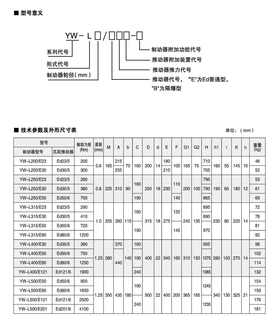 YW-L系列制動器連接尺寸及制動力矩參數(shù)符合JB/T6406-2006標準和DIN15435標準。配套符合DIN15430標準的Ed系列推動器。